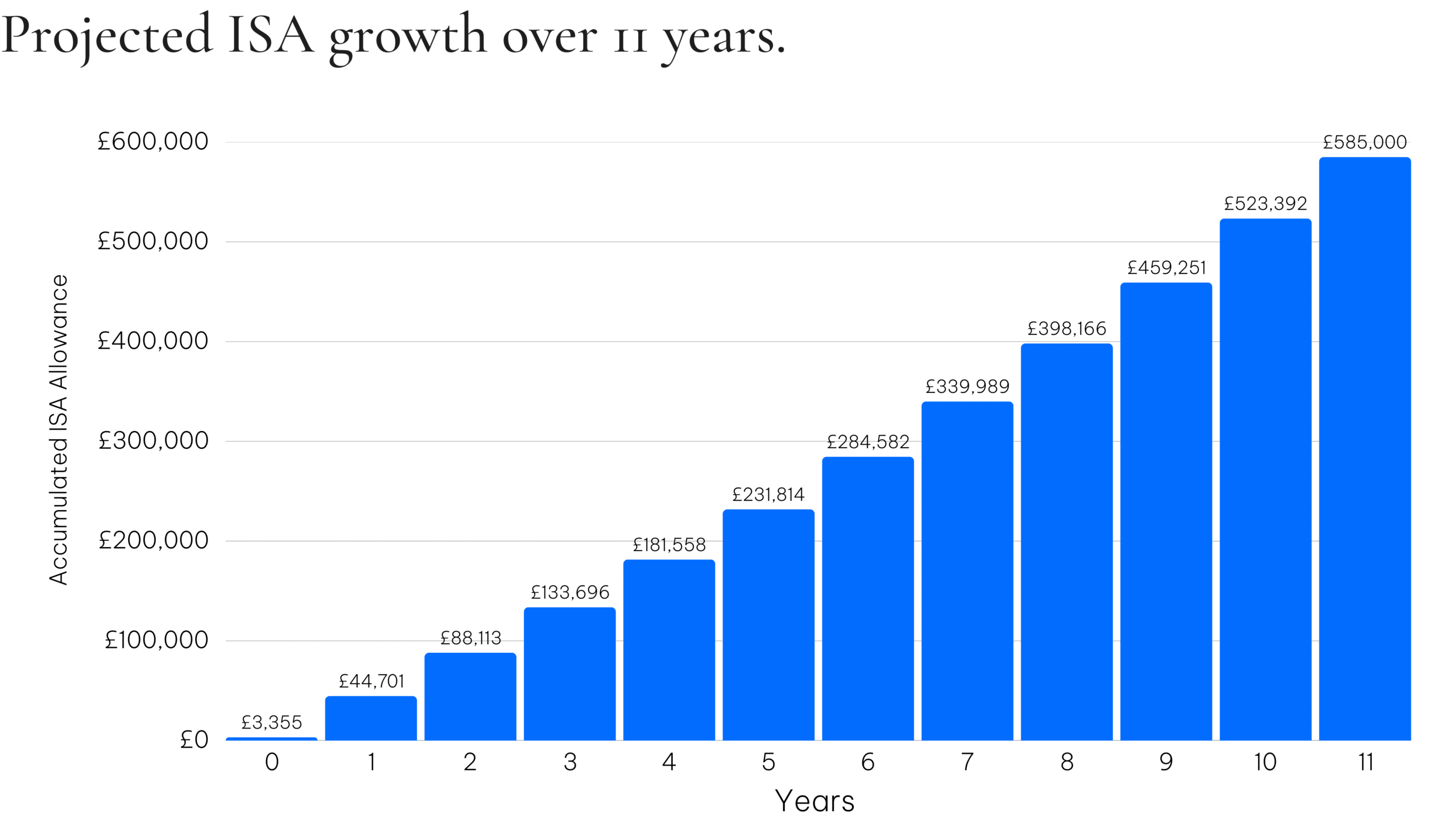If both parents contribute the maximum allowance each year from a child’s birth and achieve 5% net annual growth, this could build to around £585,000 by age 11 (illustrative only). Regular saving, even with modest amounts, can grow substantially over time.